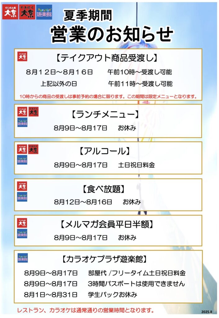 2025年8月1日 / 最終更新日時 : 2025年9月3日 大 京 夏期営業のお知らせ ※お盆期間も営業時間の変更はありません。※不明点等ございましたら、ご利用店舗にご確認くださいませ。 Screenshot
